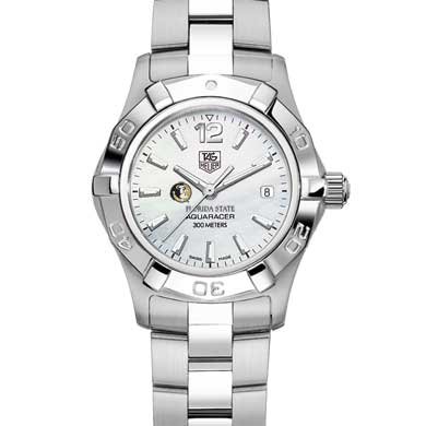 Florida State University TAG Heuer womens Aquaracer watch with Seminoles logo Florida State is written underneath White mother of pearl dial with polished markers Brushed and Polished steel bracelet with double security clasp Case stamped from a solid block of stainless steel 27 mm diameter Read More..
