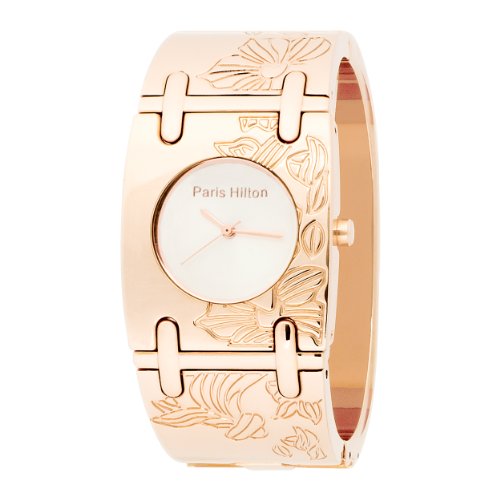 Warm gold and delicate design give the Paris Hilton Womens 138446060 Bangle White Dial Watch a modern spin on classic style The large rectangular case features a rose-gold stainless steel bezel engraved with an intricate floral design flowing along the right side of the bezel and onto the band Read More..