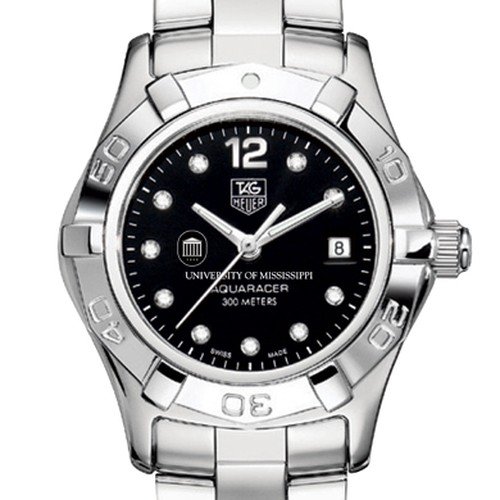 Ole Miss TAG Heuer womens Aquaracer watch with UM seal on stunning diamond dial University of Mississippi is written underneathElegant black dial set with 10 diamonds 07 carat Polished steel bracelet with double security clasp Case stamped from a block of stainless steel 27 mm diameter U Read More..